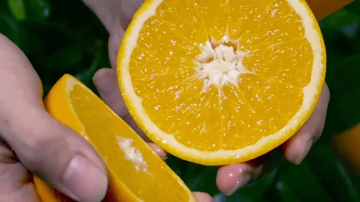 风味出众→橙香浓郁、汁水丰盈、脆嫩化渣,甜中带着微酸,正是脐橙的本真之味!